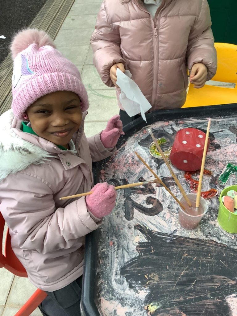 In maths, EYFS have been practising their number formation using chalk, water and paintbrushes. They also honed their subitising skills with a dice.